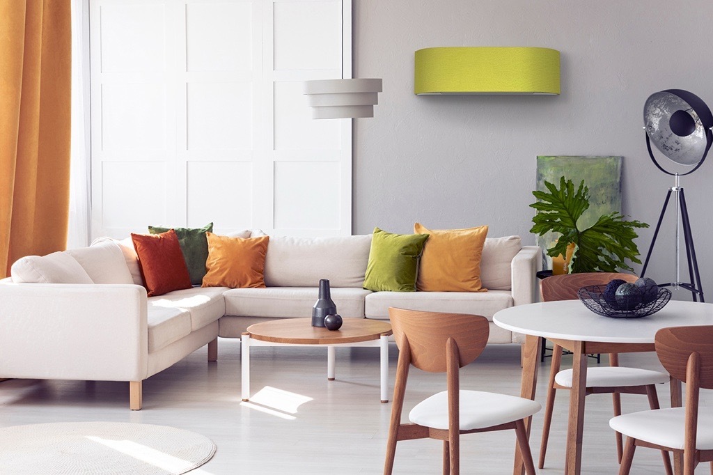Tilleggsfarger er tilgjengelig som tilbehør, så om du maler veggen eller bytter ut sofaen, kan du enkelt skifte stofftrekket på varmepumpen selv.